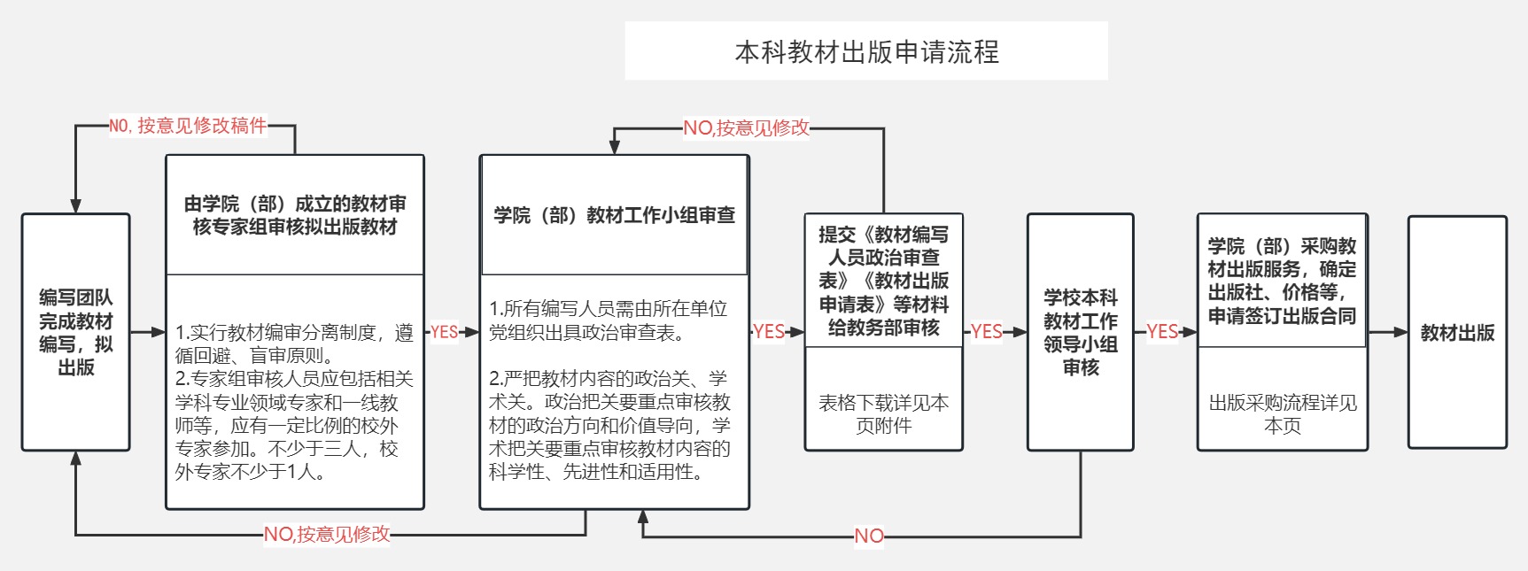 (四)教务部对学院(部)出具的教材编写审核意见等资料复核后,提交学校本科教材工作领导小组审核。经学院(部)和学校复审的教材可进入教材出版服务采购环节。