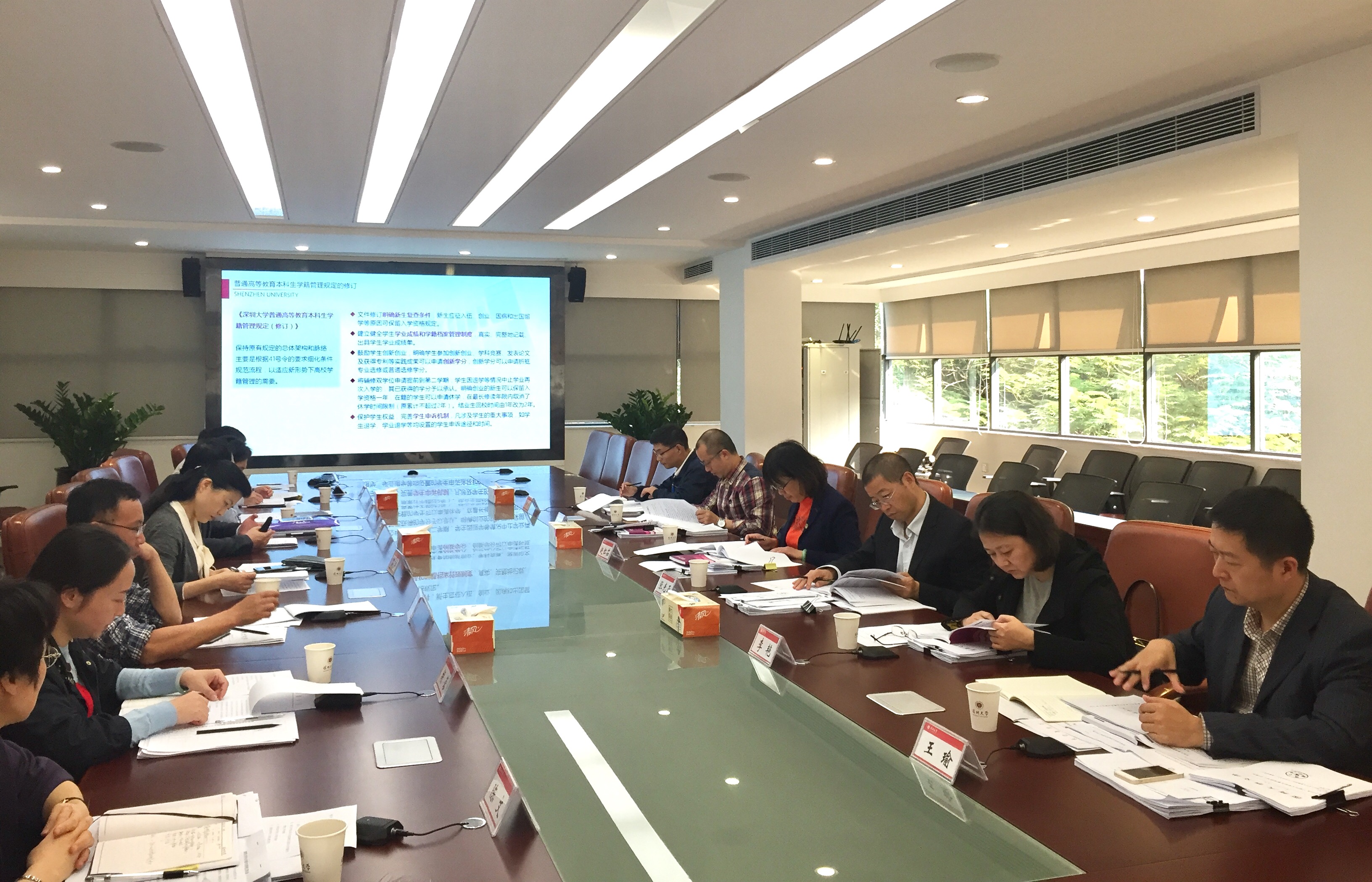 教务部袁磊主任根据广东省教育厅的文件要求,对深圳大学学生管理规定修订具体情况、新生学籍学历管理工作情况、成人高等教育学籍学历管理情况三个方面进行了汇报,并着重介绍了学分制收费与管理、主辅修、创新学分奖励、雅思托福学分转换等特色制度,细致全面地讲解了我校学籍学历管理改革工作的推进情况。