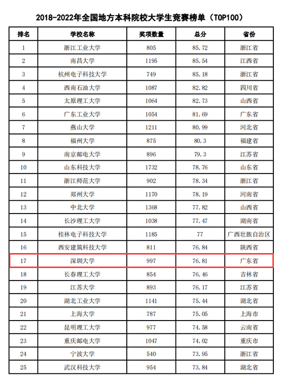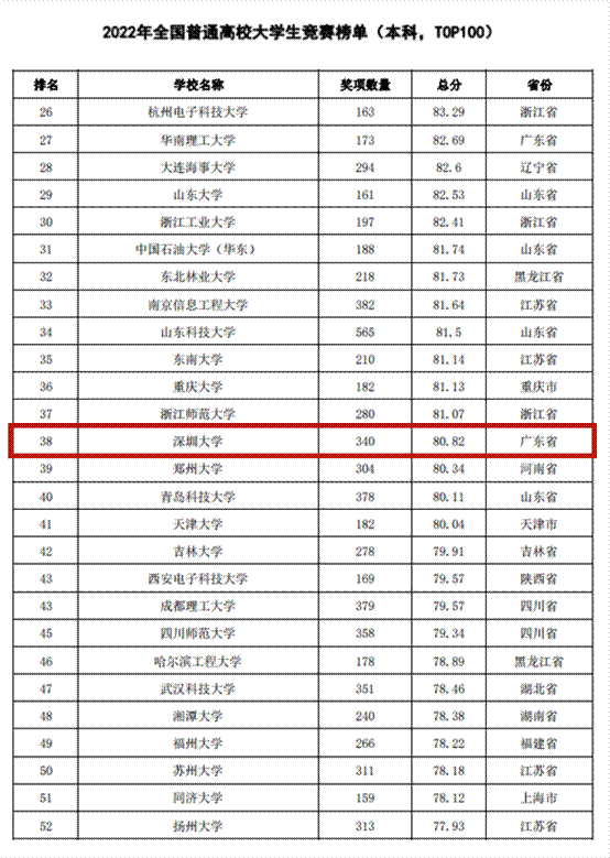 近日,中国高等教育学会发布《2022全国普通高校大学生竞赛分析报告》(以下简称《分析报告》)。我校成绩喜人,在2022年全国普通高校大学生竞赛榜单(本科,TOP100)中排名38,广东省第3,较上一年度全国排名跃升11位!