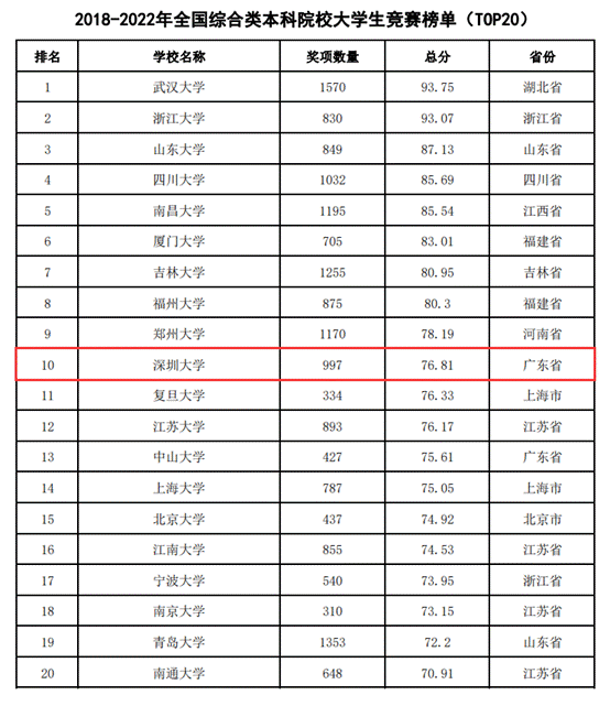 在2018-2022年全国综合类本科院校大学生竞赛榜单(TOP20)排名第10位,较上一年跃升6位。
