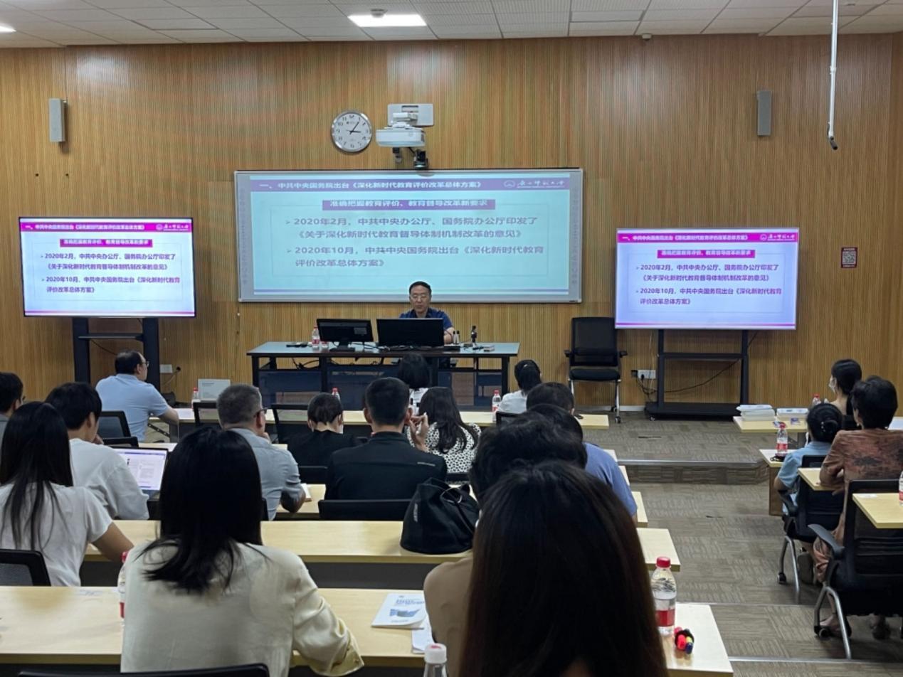 周长山处长作“以评定向,以评促强,扎实做好学校评建工作”专题报告。他从“《深化新时代教育评价改革总体方案》”、“教育部党组启动新一轮审核评估”、“动员、自评整改阶段”、“接受评估阶段”、“评估整改阶段”五个方面作详细阐述如何扎实做好学校评建工作。周处长首先介绍了中共中央国务院出台的《深化新时代教育评价改革总体方案》,指出了方案出台的背景及意义。接着,周处长结合广西师范大学的审核评估经验,详细说明每个阶段的工作目标及任务,重点介绍了宣传动员阶段、自查自建阶段、自评整改阶段、接受评估阶段、评估整改阶段的工作重点,并依次讲解了新一轮审核评估的六个突出特点。