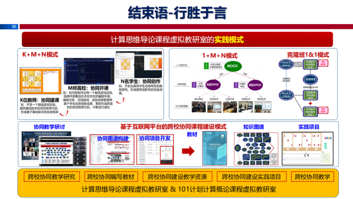 战德臣表示,虚拟教研室是信息化时代新型基层教学组织建设重要探索,建设任务主要是创新教研形态、加强教学研究、共建优质资源、开展教师培训,主要特征有名师引领、中心聚焦、平台支撑、共建共享、成果累积、协同教研、水平提升等。战德臣以其主持的教育部虚拟教研室项目——计算思维导论课程为例,介绍了协同发展历程、协同工作积累等,并详细阐述了完善平台各版块建设、协同教研、协同探索新型教学模式、教师培训会与教学研讨会等四项建设内容。战德臣凭借其丰富的教学经验和体会,将理论紧密联系实践,为寻求虚拟教研室的建设路径提出深刻见解。