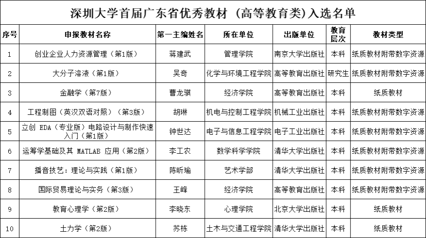 教材是育人的核心载体,教材的质量影响着人才培养的质量。我校始终牢记“为党育人、为国育才”初心使命,将教材建设作为强化课程建设、提升人才培养质量、推进本科教育教学改革的重要抓手。近年来,学校教材建设紧紧围绕面向未来的创新创业人才培养目标,积极适应科技创新、社会发展、产业变革和人才培养要求,推动教材内容与学科前沿、产业实践深度融合,充分发挥教材在“立德树人”中的基础支撑作用。此次我校 10 本教材入选首届广东省优秀教材,既是教师团队深耕教学、潜心编研的成果,也是我们持续推进高水平教材建设的动力。