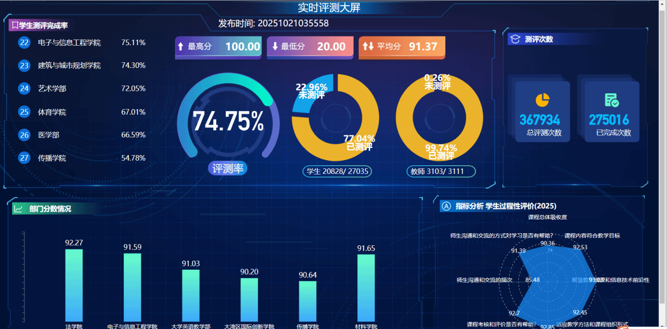 本次评价工作覆盖当前所有课程,共发布待评数据367934条。各教学单位高度重视,精心组织,短短一周时间,学生参评率为74.75%,回收学生评价数据样本共计275016条。评价涉及开课部门40个,被评教师3103名,参与评价的学生人数达27035人。从本次评价结果来看,教师普遍能做到拟定合理的教学目标,确定符合教学目标的课程内容,运用合适的教学方法,引入先进的教学资源,但同时需要引起重视的是,学生对于师生沟通频次和方式等方面提出的建议意见较为集中,一定程度上影响了学生的学习吸收度,因此,后续教师应加强师生沟通,及时解决学生学习过程中遇到的疑点难点,增强学生的学习收获。