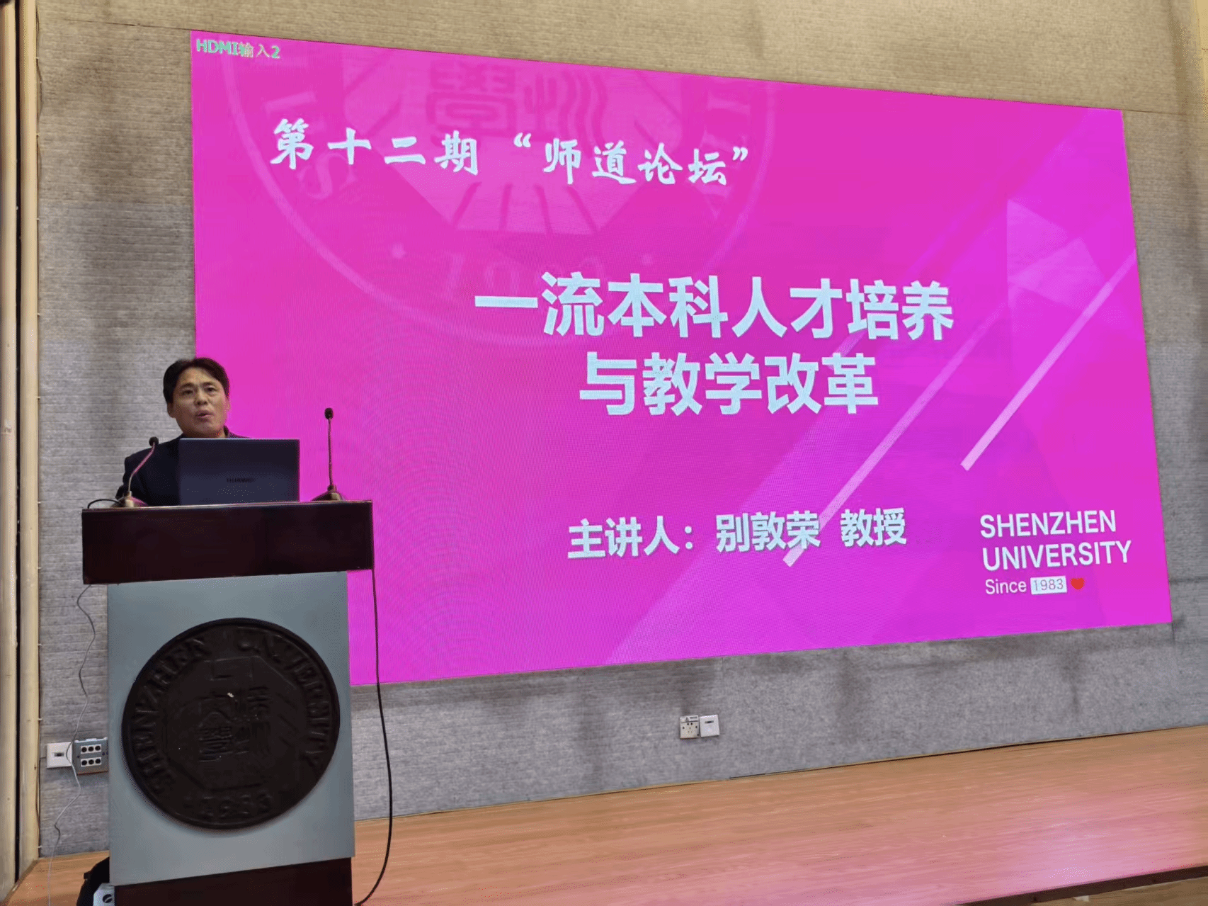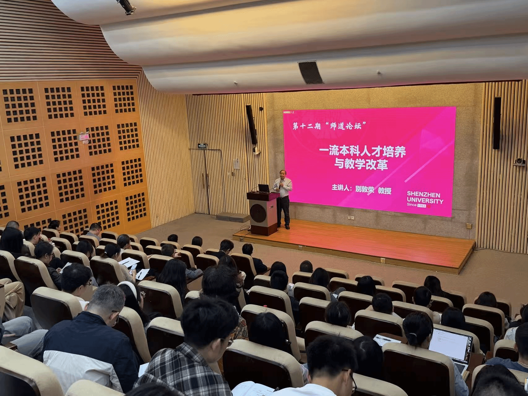 2025 年 10 月 24 日,由教务部教师教学发展中心主办的第十二期 “师道论坛” 在汇星楼三号报告厅顺利举行。本期论坛以 “一流本科人才培养与教学改革” 为主题,特邀厦门大学南强学者特聘教授、教育研究院院长别敦荣教授担任主讲嘉宾。教务部主任任祥忠主持论坛,各学院(部)分管本科教学副院长(副主任)、本科专业负责人、基层教学组织负责人、“薪火计划”青年教师及骨干教师、教学秘书、教务部教师教学发展中心等 150 余人参会。