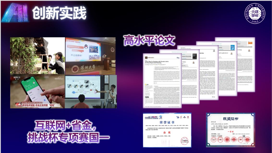 专业实习优秀基地包括腾讯云、字节跳动等知名企业,学生课内外实践包括人工智能(腾班)学生创新实践。其中腾班自研特色家禽智慧养殖系统应用于澄海狮头鹅和贵州赤水乌骨鸡,由深大教师与腾讯云企业导师联合指导。