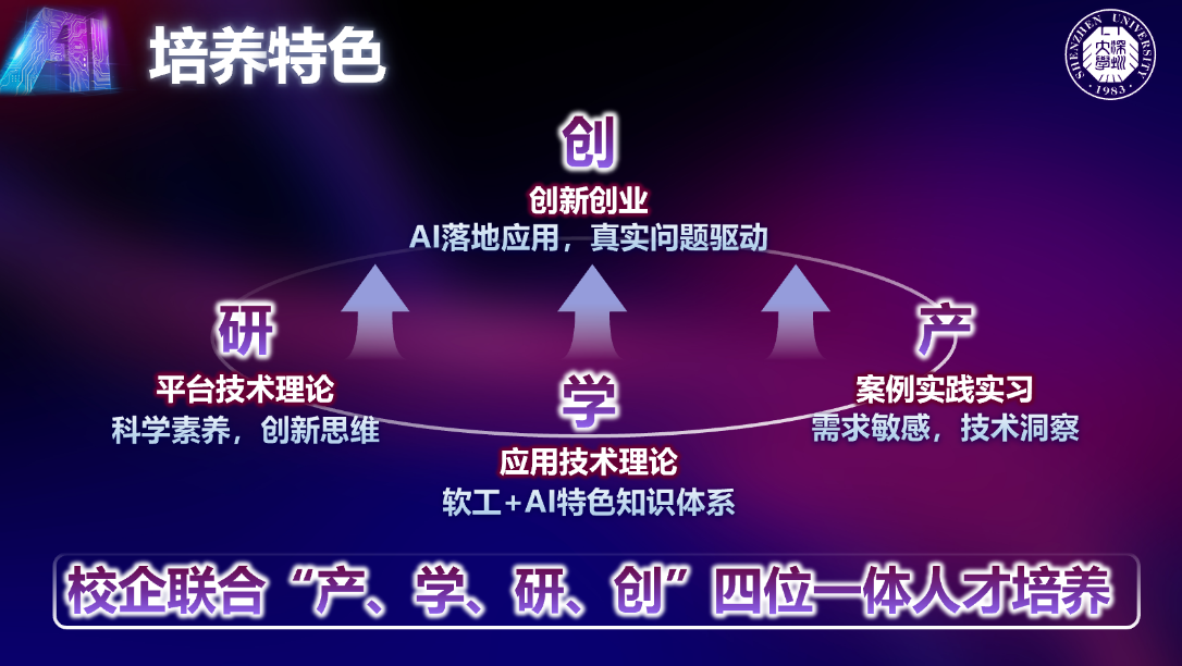 深圳大学人工智能专业依托广东省首个人工智能学院深圳大学-腾讯云人工智能学院(成立于 2018 年,2020 年入选广东省示范性产业学院,2021 年入选国家教育部首批现代产业学院),面向科研和产业链对人工智能领域人才的迫切需求,充分利用计算机与软件学院优秀师资和人工智能科研优势及核心特色课程,并结合腾讯云的教育云资源、企业案例、腾讯的实习实训机会等, 以“产、学、研、创”四位一体为核心要素,结合新工科理念,深化产教融合,创新人才培养的校企合作模式,培养学生人工智能工程问题的发现、分析、设计、实现和优化能力。