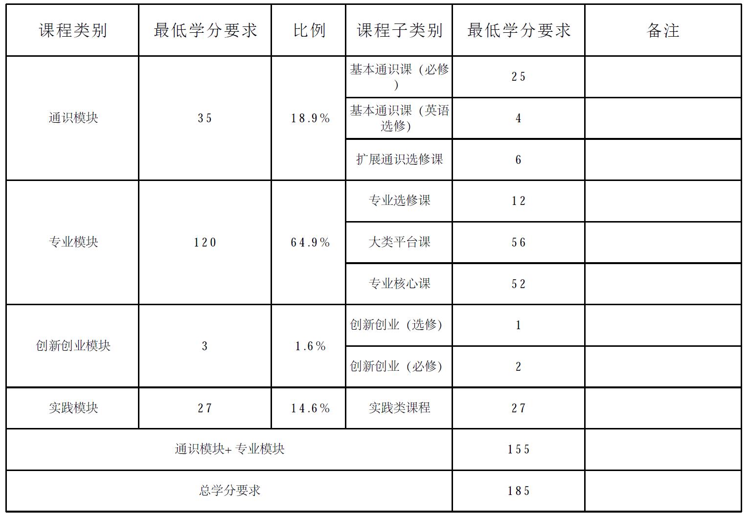 (2) 专业模块:大类平台课程56学分,专业核心课程52学分,专业选修课程12学分,