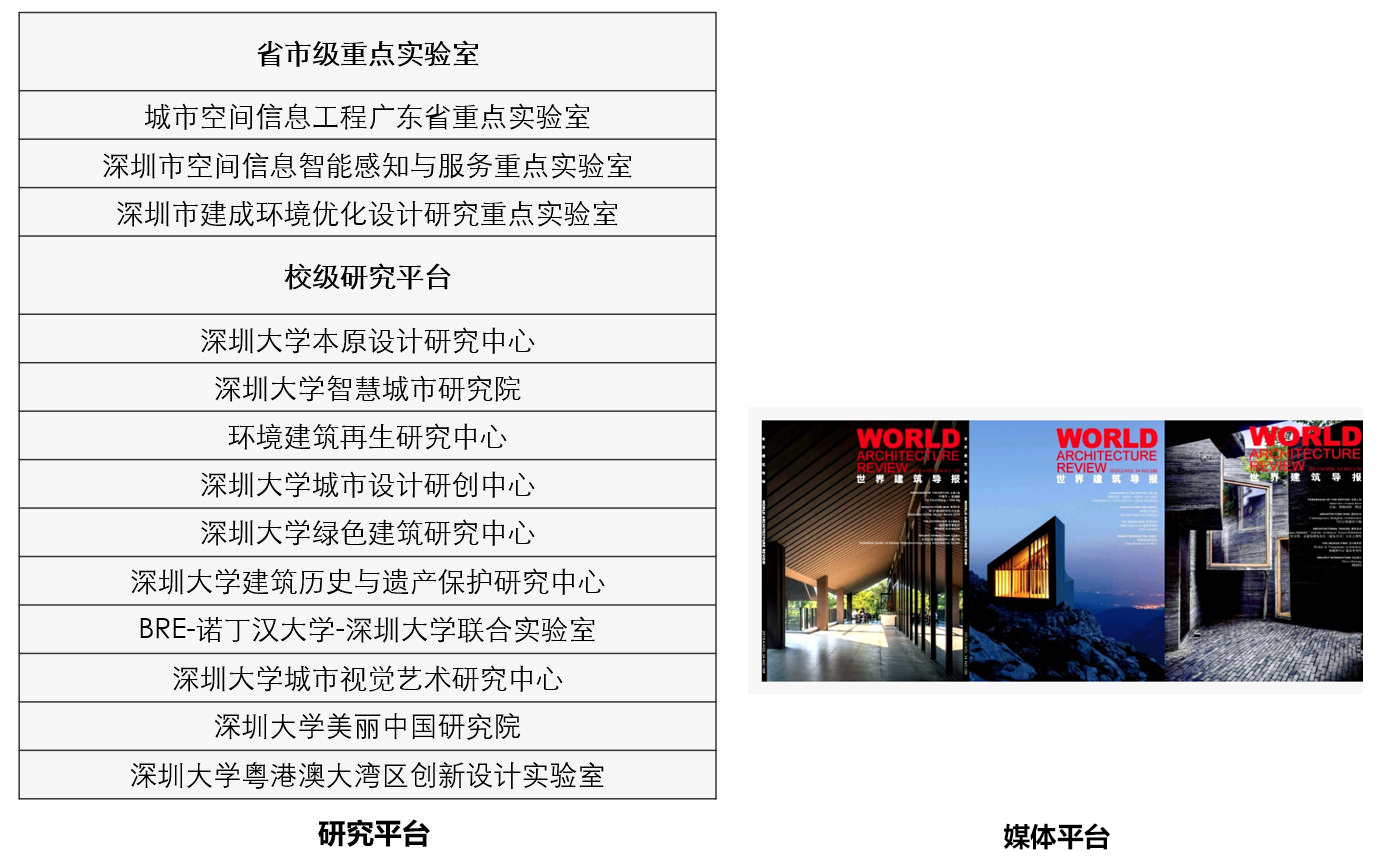 建筑学专业依托深圳市建成环境优化设计研究重点实验室等省市级重点研究平台,开展高水平的教学科研工作。建筑与城市规划学院建有建筑物理实验、建筑模型与构造实验室、低碳城市与建筑节能实验室、空间认知设计虚拟仿真实验室、造型艺术实验室等。均配置量较为先进的设备,为师生开展教学、科研及实践提供支撑。建筑物理实验室拥有建筑声光风热实验与测试设备仪器133 台,承担建筑物理、生态建筑学等课程实验教学。建筑模型与构造实验室拥有KUKA机械臂、三维激光扫描仪、3D 打印机等设备,为学生建造、模型制作提供技术及场地支持。低碳城市与建筑节能实验室主要承担绿色与健康建筑设计实践课程。空间认知设计虚拟仿真实验室拥有虚拟仿真设备及软件,承担公共建筑安全设计、历史建筑虚拟测绘、空间建构原理虚拟仿真等实验课程教学。造型艺术实验室则主要承担美术、造型艺术等相关课程教学。