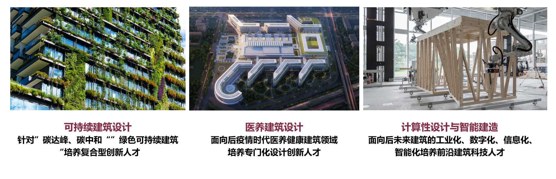 (5) 专业背景方面,教师团队在超大尺度和复合化公共建筑设计、高密度居住建筑和城市设计、既有建筑保护与更新以及绿色建筑技术与设计四个主要研究方向上逐步形成特色成果。