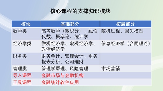 课程设置:微观经济学(英文版)、宏观经济学(英文版)、金融学、商业银行经营与管理、证券投资、金融衍生工具、金融工程、国际金融(英文版)、公司理财学(英文版)、会计学原理、财务会计学、财务报表分析与证券估值(英文版)、财政学、金融统计分析、金融计量分析、国际结算(英文版)、风险管理原理、固定收益证券、投资项目评估、数学分析、高等代数、常微分方程、偏微分方程、概率与统计学、随机过程、计算机基础、MATLAB程序设计等。