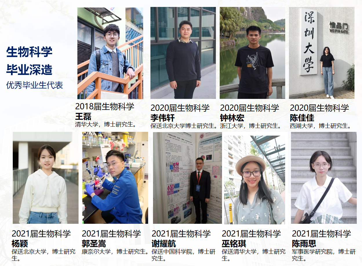 生物科学专业作为国家一流专业建设点、广东省特色专业,凭借系统而完备的生物科学课程体系和特色鲜明的办学模式,构建递进式培养模式,强化专业基础、提升学生科研素养;赛教融合、以赛促教的进行特色创新人才培养;设立了“生物信息学”微专业,以培养交叉学科复合型创新人才;通过双语教学与联合办学,培养优势国际化人才;最终着眼于培养具备宽厚而扎实的生物科学理论知识,并受到系统而严谨的科研训练,能从事生命科学及相关领域的科学研究、技术开发与管理等方面工作的创新型卓越人才。