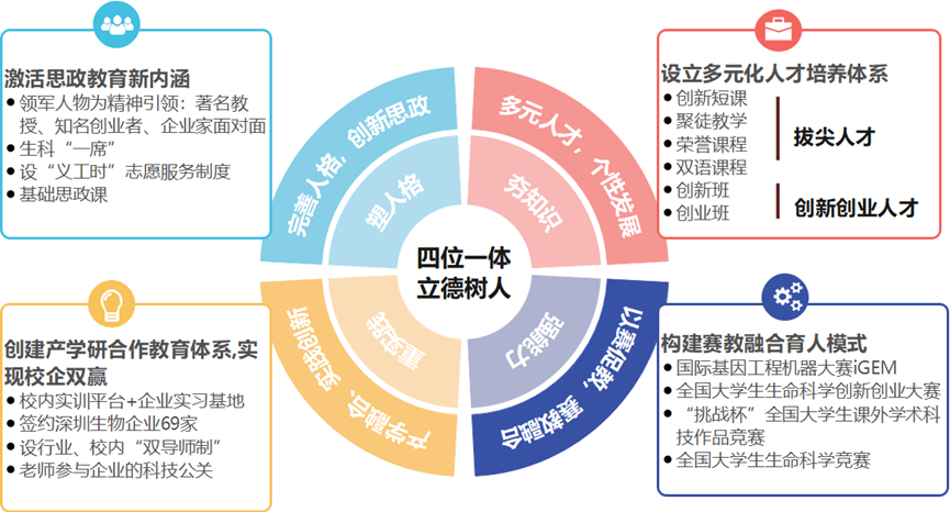 围绕“塑人格、夯知识、强能力、重实践”的“四位一体、立德树人”人才培养理念,秉承脚踏实地、自强不息的深大精神,多元化培养具有浓厚家国情怀、世界胸怀和国际视野,专业技术过硬和核心竞争能力强的现代生物技术行业中坚力量及后备人才。