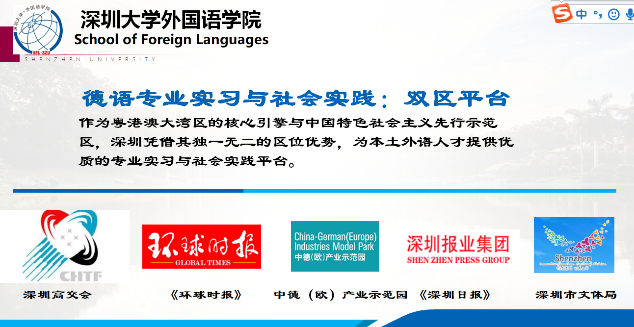 实践教学旨在促进学生全面发展,主要包括专业实习、创新创业实践、社会实践、国际交流等。目前德语专业依托外国语学院优质的实习实践基地和专业自身平台,与深圳中德(欧)产业园、深圳高交会、环球时报等多家机构开展专业教学实践合作。