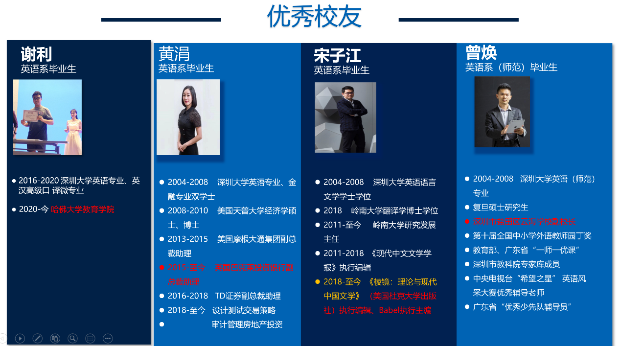 英语专业秉承深圳大学敢为人先、勇于创新的文化基因,承续北京大学援建基础,人才培养体系完备、紧密结合课程思政,始终铭记习近平总书记提出的三问:培养什么人、怎样培养人、为谁培养人。围绕立德树人这个核心点,坚持知识传授和价值引领相统一,坚持显性教育和隐性教育相统一,积极主动地挖掘英语学科文化中的育人资源,同时鼓励教师即时便捷地将党政和社会时事词条推送到微信或QQ课程群,党员教师带头充分利用“学习强国”等时政英语资源平台推送时事词条到课程群,将思政教育融入专业课程教学和实习实践教学环节,在教学过程中实现“润物细无声”,达到潜移默化的育人效果。