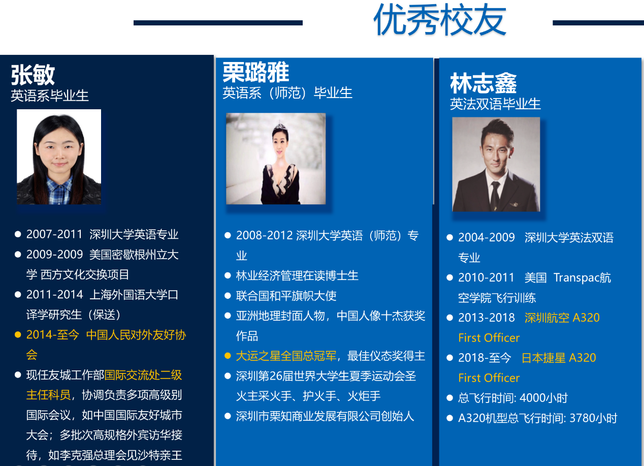 深圳大学外国语学院英语专业致力于服务国家战略,深度融入地方发展大局,坚持厚基础、宽口径、差异化培养路径,坚持多层次、多元化办学,立足“粤港澳大湾区”和“中国特色社会主义先行示范区”,培养具有宽广国际视野、深厚家国情怀、跨文化交际能力、创新思辨能力,通晓国际及区域规则的高层次英语专业复合型人才。