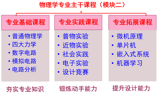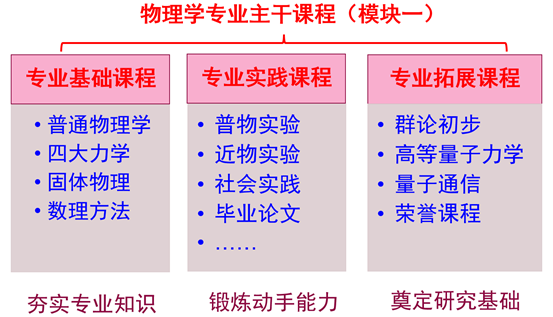 物理学专业有两个课程模块,课程模块一主要着重培养基础研究性人才,课程模块二主要着重培养高新技术和信息产业应用型人才。