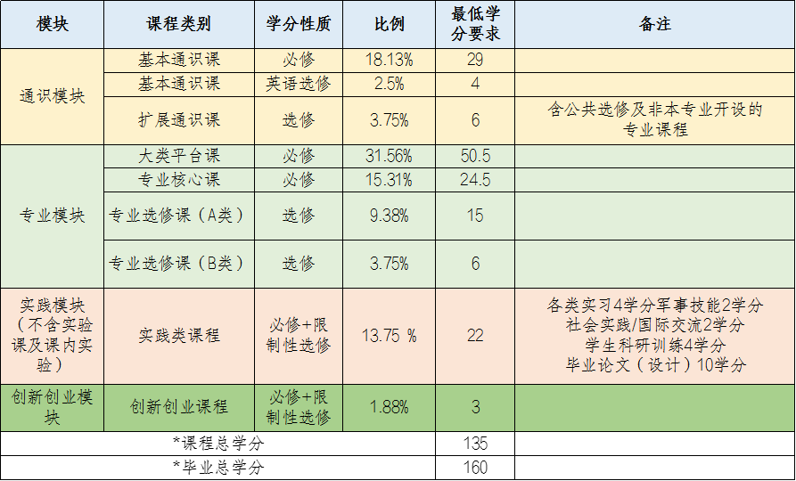 *注:1.课程总学分为通识模块和专业模块课程学分合计,学校按课程学分收费。
