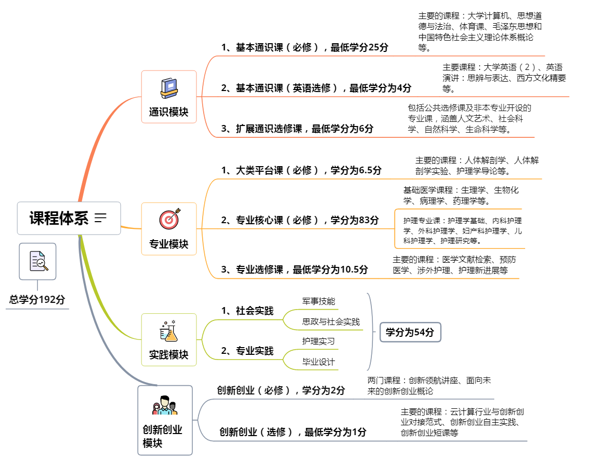 专业模块:占总学时52.1%,在第1-6学期完成,是主干课程和综合课程的主体部分,要求学生掌握医学以及护理学基本理论知识和技能,为临床实践提供专业知识基础和基本技能训练。包括专业核心课:护理学基础、内科护理学、外科护理学、妇产科护理学等。专业选修课:护理新进展、涉外护理、循证护理学概论等。