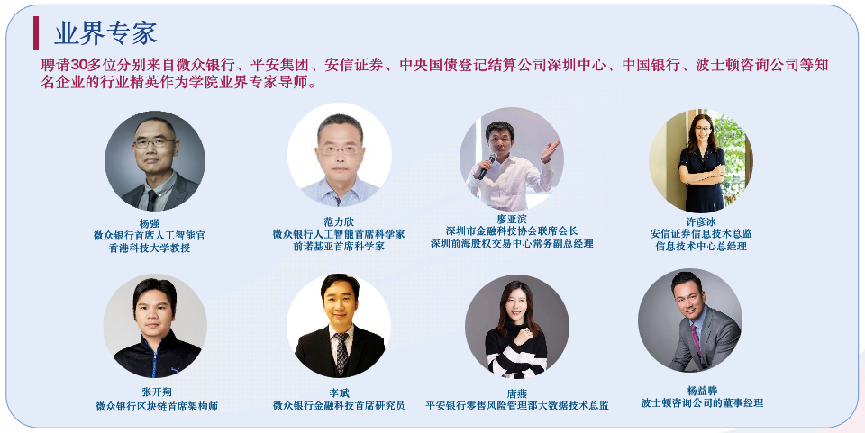 雄厚业界师资实力-学院聘请多名金融科技业界大咖与学界知名专家学者作为学院访问教授,同时聘请30多位分别来自微众银行、中央国债登记结算公司深圳中心、中国银行、平安集团、波士顿咨询公司等知名企业的行业精英作为学院业界导师,深度参与学生培养过程中的实践与教学环节。