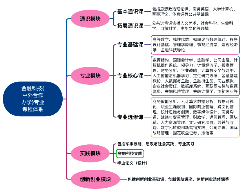 文理双修,课程覆盖金融与计算机核心课程,侧重应用与实践,涉及多学科、多领域交叉培养,涵盖经济、金融、计算机、管理等专业核心模块。