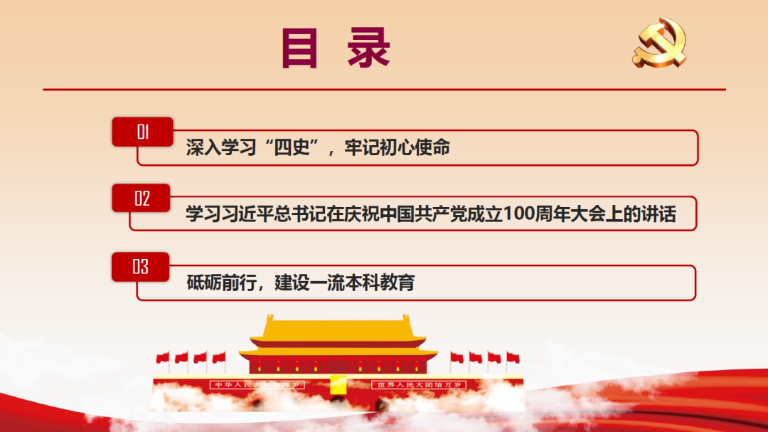 袁磊书记的党课题目是《学习党史强信念,不忘初心砥砺行》,涵盖三个主要部分:第一、深入学习“四史”,牢记初心使命;第二、学习习近平总书记在庆祝中国共产党成立100周年大会上的讲话;第三、砥砺前行,建设一流本科教育。